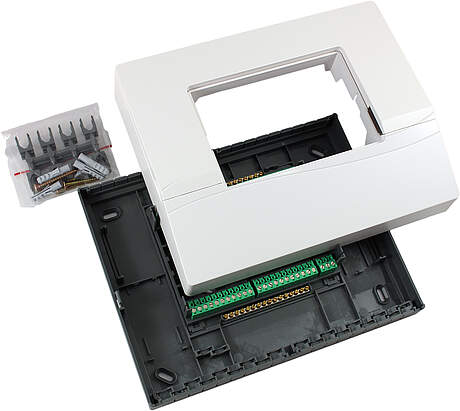 Comprising terminal mounting plate and housing (GEHAEUSE-KONSOLE UVR16x2). Both parts can also be ordered separately. The console has a total of six assembly positions for various auxiliary modules (relay module, var. bus adapters, board of the radio receiver RCV-DL and the like).