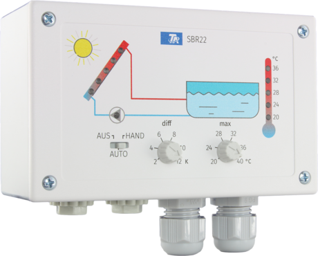 The controller SBR22 is a differential controller for the solar charging of swimming pools. The two outputs allow controlling a changeover valve and the swimming pool pump.
