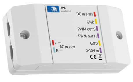Der APC wandelt ein 0-10V Steuersignal in zwei PWM-Signale um (100-0 und 0-100). Geeignet, wenn etwa eine 0-10V Pumpe durch eine PWM-Pumpe ersetzt werden soll und der vorhandene Regler kein PWM-Signal ausgeben kann. Stromversorgung mit 8-28 V DC oder 230 V AC.