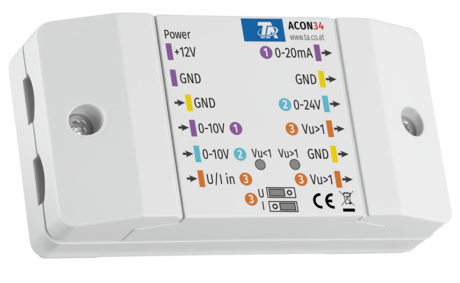 Dieses Gerät ist zur Signalanpassung zwischen UVR-Reglern und Fremdgeräten sowie Industriesensoren geeignet. Es können damit unterschiedliche Signalpegel bzw. Strom in Spannung und umgekehrt gewandelt werden. Dank Eingangsfilter lassen sich auch PWM- Signale in Analogwerte wandeln. Signalwandlung von 0-10 V => 0-20 mA und von 0-10 V => 0-24 V, zwei einstellbare Verstärker mit Spannungsausgang: 0-10 V oder 0-20 mA Signal (Wahl über Jumper) mit einer Verstärkung 1-5 und einer Dämpfung 1-5.