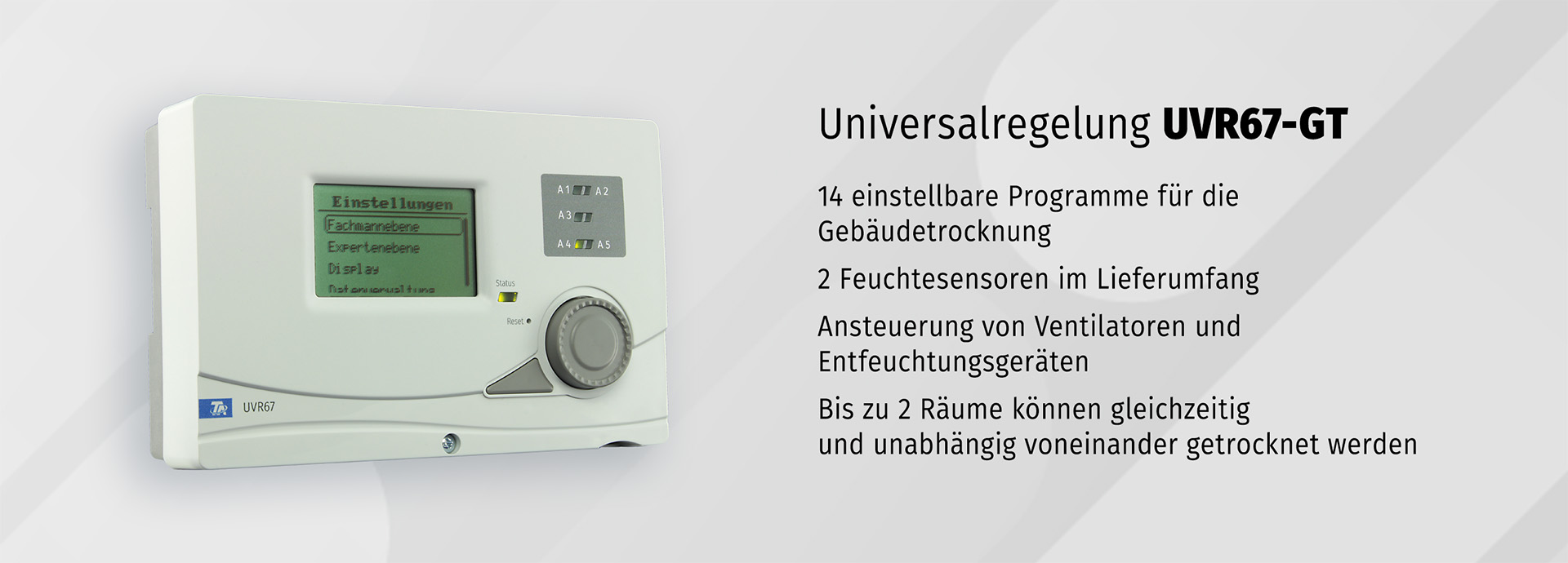 Unter den mehreren 100 einstellbaren Programmen finden sich auch 14 Programme für die Gebäudetrocknung, mit denen Ventilatoren ein- und ausgeschaltet und Entfeuchtungsgeräte angefordert werden können. Mit den mitgelieferten Sensoren werden alle relevanten Werte wie Luftfeuchtigkeit und Temperatur überwacht.
