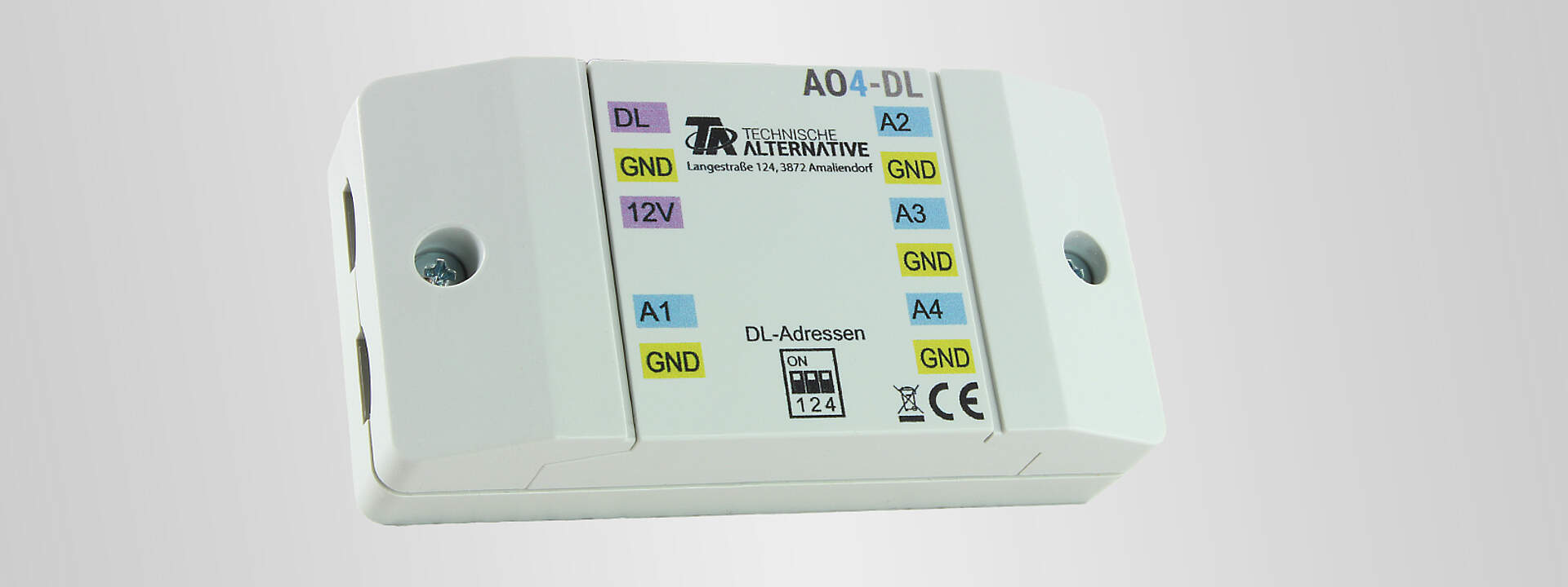 Durch die Wahl des Index kann der Modus 0-10V oder PWM für jeden einzelnen Ausgang ausgewählt werden. Die Spannungsversorgung erfolgt über den 12V-Ausgang eines Reglers UVR16x2 oder RSM610. Dadurch ist die DL-Buslast des Moduls sehr gering. In Verbindung mit Hilfsrelaismodulen (z.B. HIREL22) kann das Modul AO4-DL auch als Erweiterungsmodul für zusätzliche Schaltausgänge eingesetzt werden.