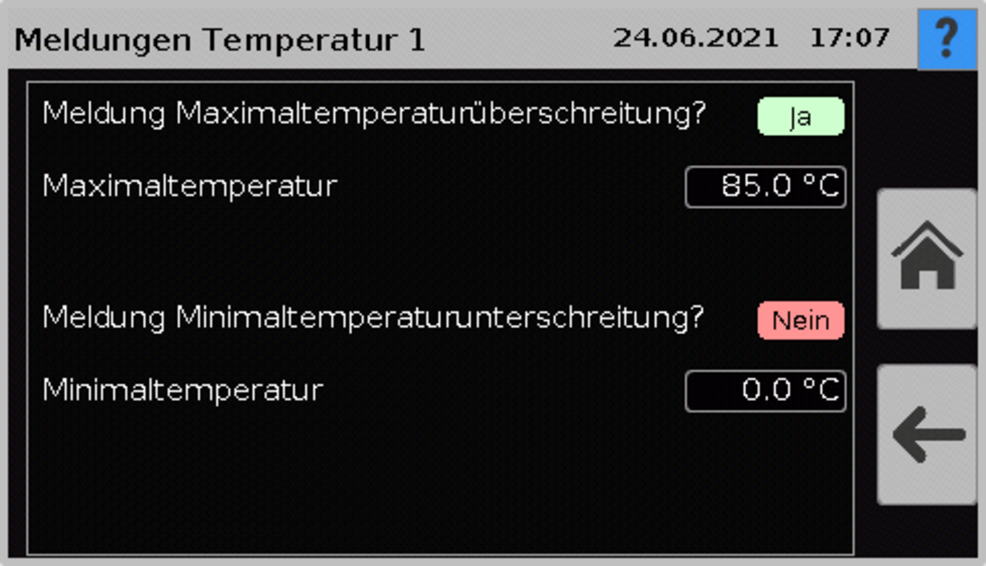 Oberfläche am Touch-Display mit Einstellungen für Meldungen