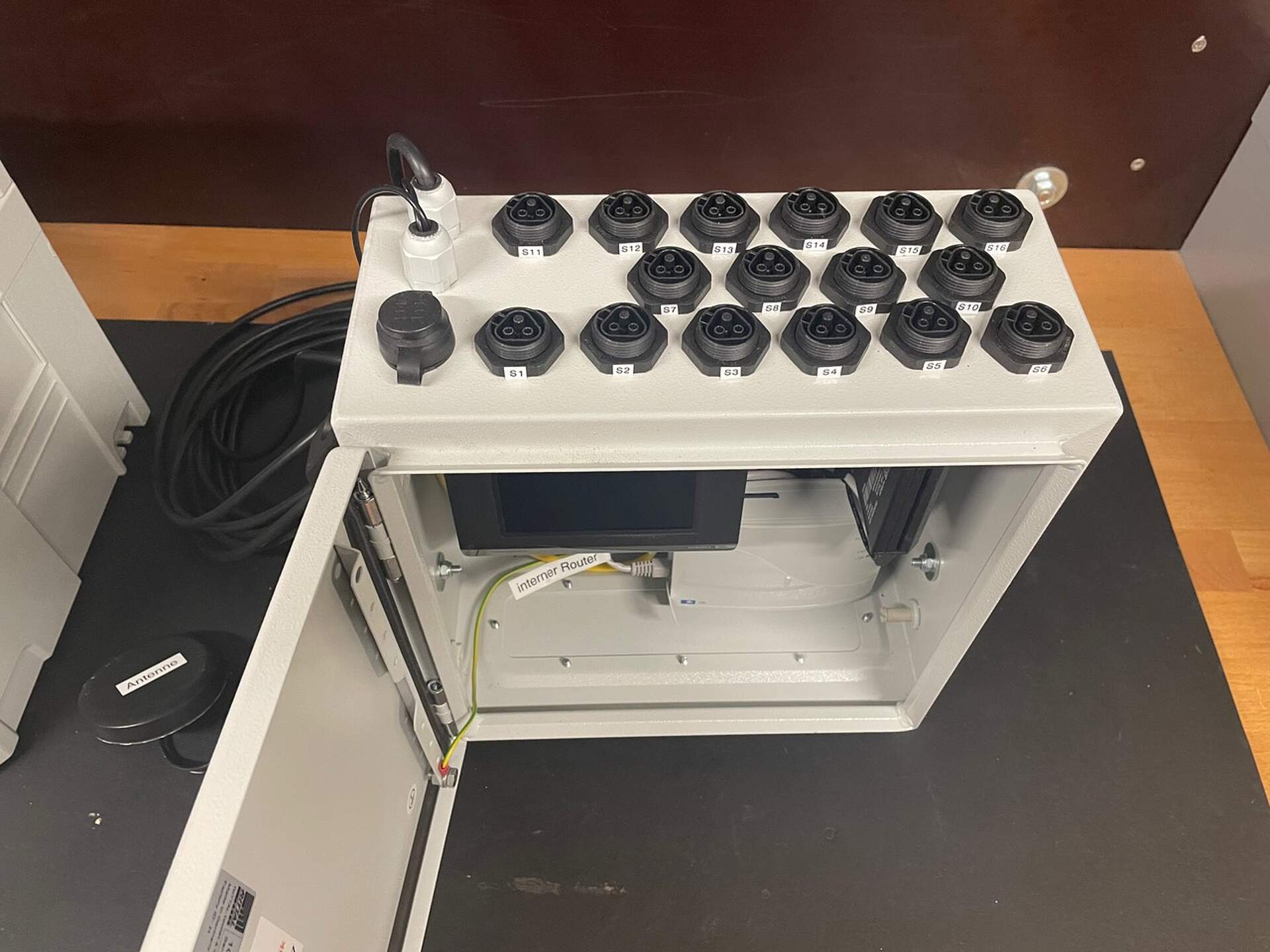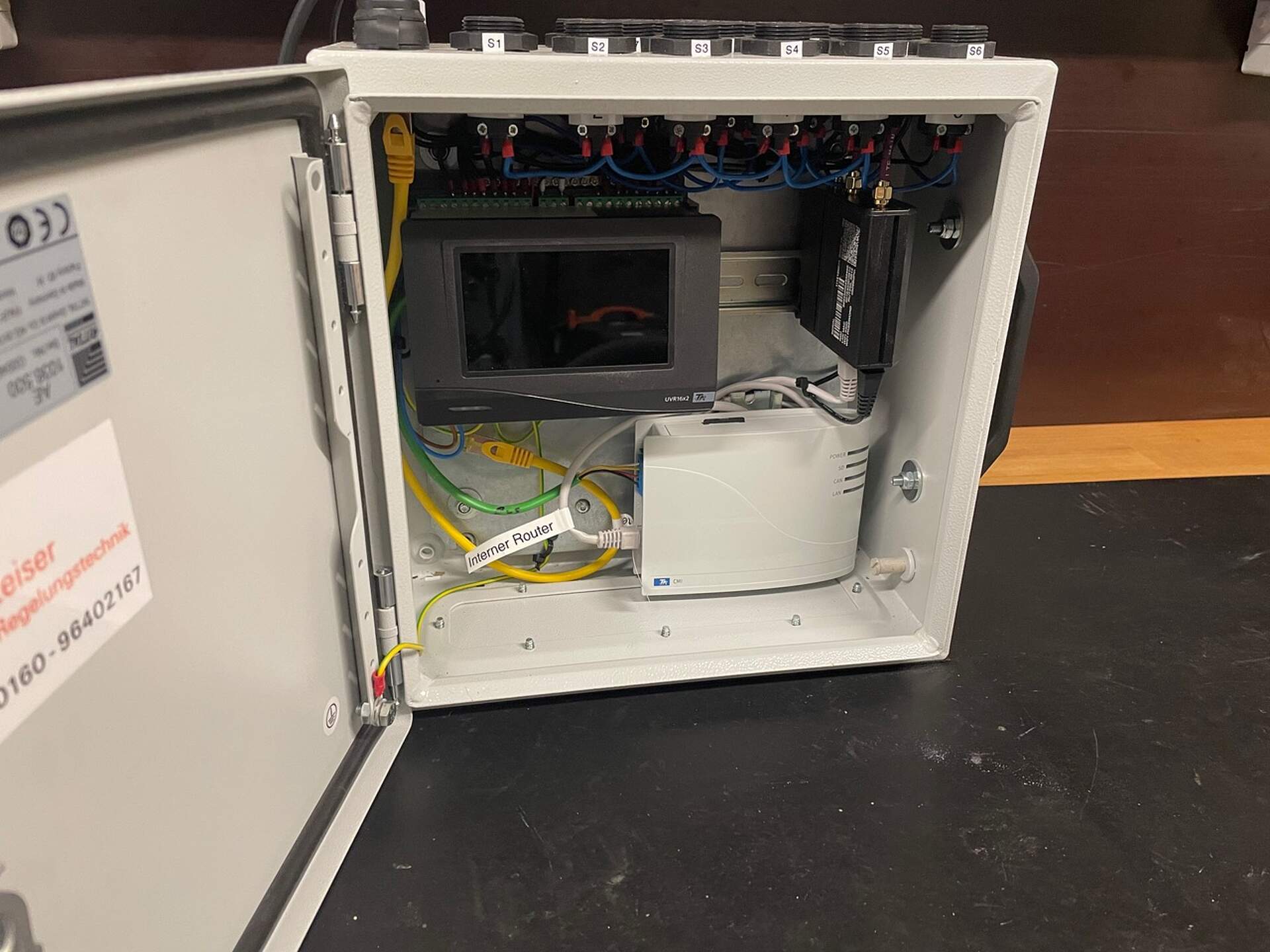 Herausgekommen ist ein kleiner Schaltschrank mit einer UVR16x2 und einem C.M.I. für Datenlogging und Fernzugriff. Beide Geräte sind dabei fix verdrahtet, wobei alle 16 Sensoreingänge der Universalregelung nach außen geführt wurden. An der Oberseite des Schaltschranks können die steckerfertig mitgelieferten Sensoren angeschlossen werden. Und auch das C.M.I. kann flexibel entweder über den intern verbauten LTE Router oder optional über einen externen Router mit dem Netzwerk verbunden werden.