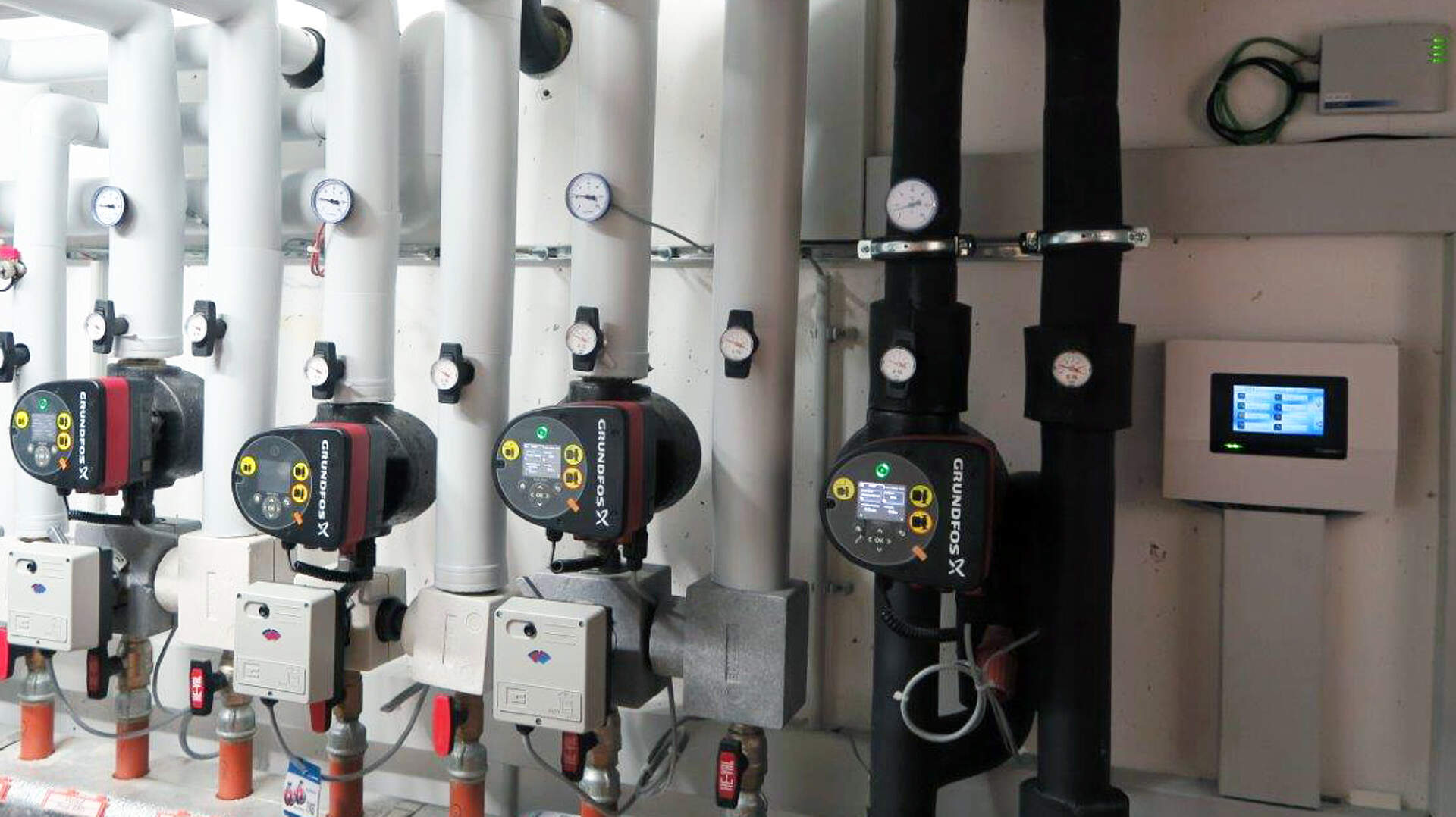 Wärme- und Kälte werden mit einer Wärmepumpe, Erdsonden und über Wärmerückgewinnung erzeugt und in einem Wärme- und Kältespeicher bereitgestellt. Es gibt dabei einen reinen Kühlkreislauf der die Kühlkonvektoren versorgt, und zwei Heiz-/Kühlkreise mit denen Radiatoren bzw. Deckenstrahlplatten in den Produktionsräumen bei Bedarf versorgt werden.