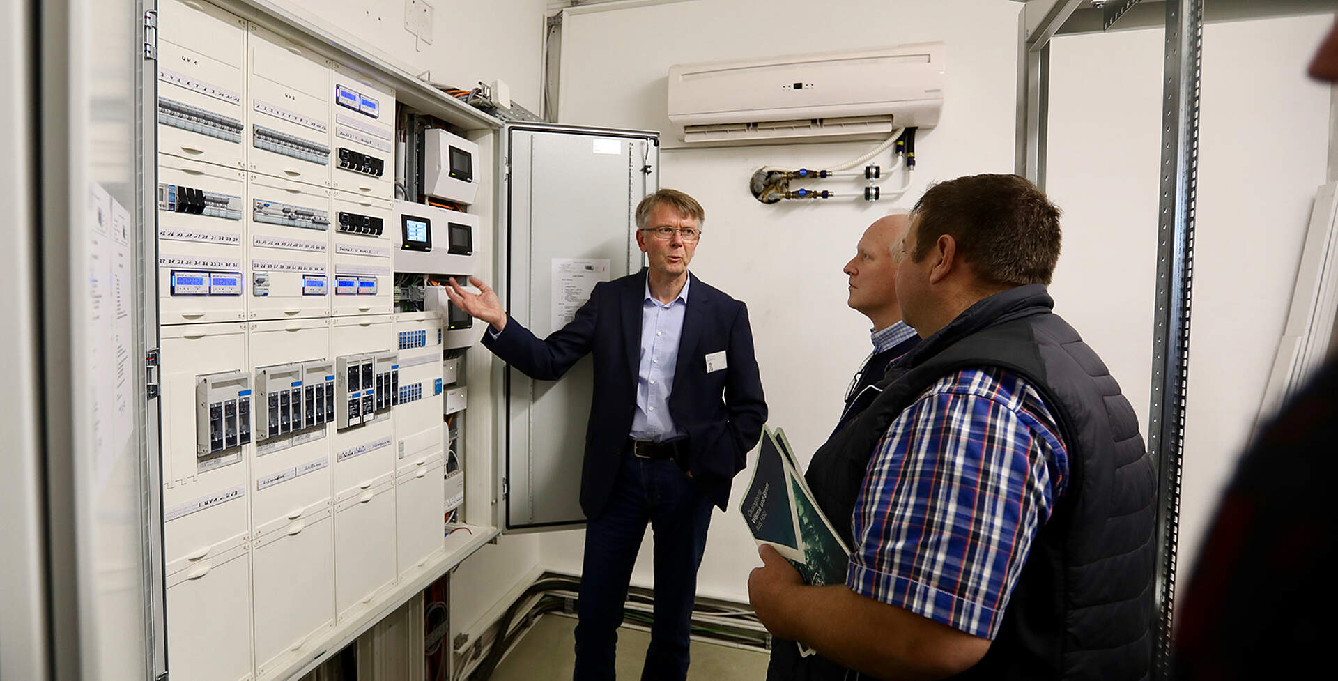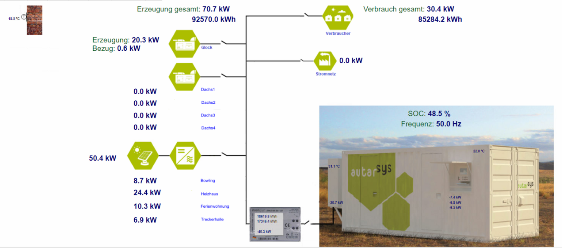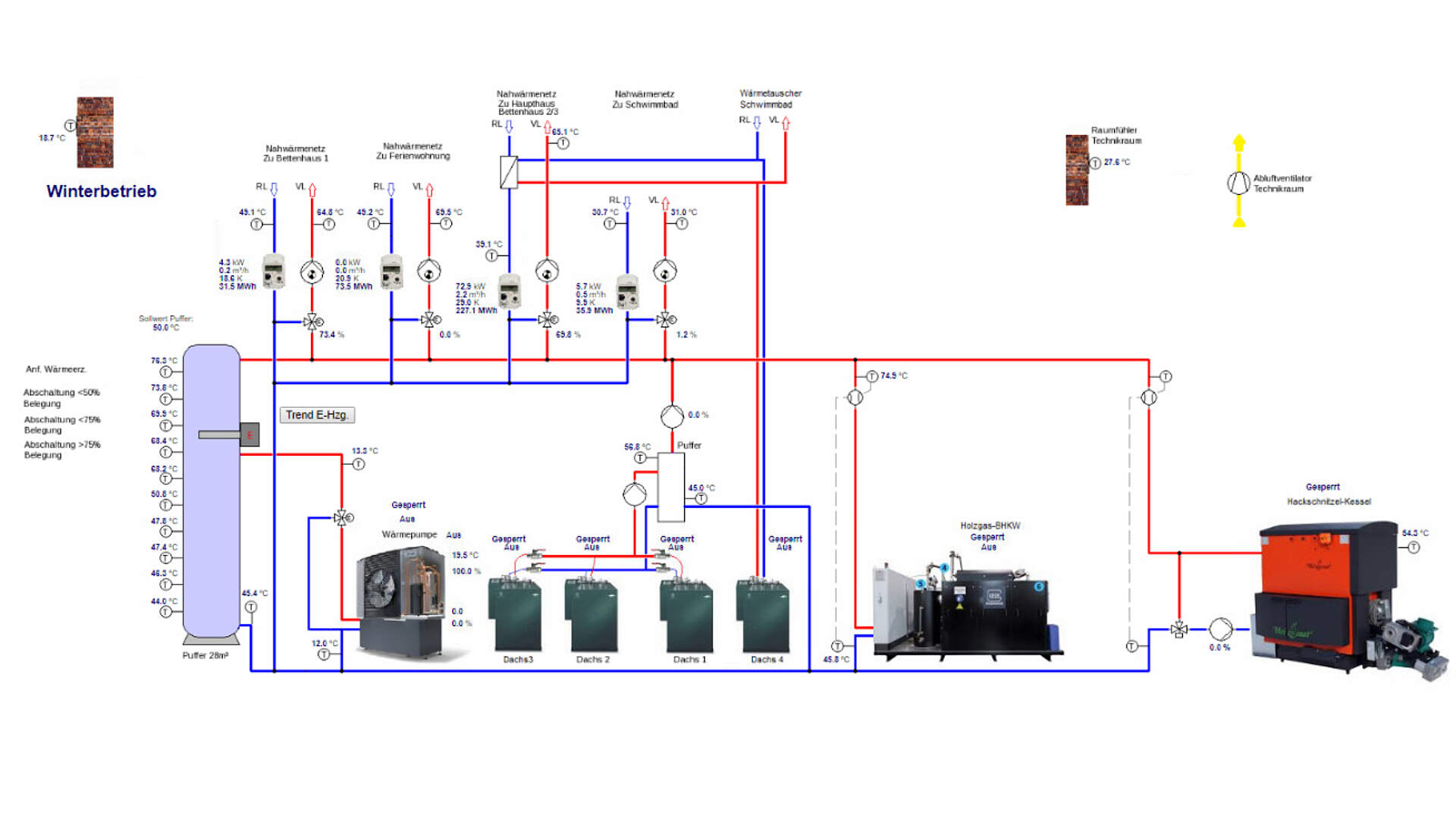 Die Basis der Energieversorgung übernimmt der selbst erzeugte Strom aus der 118 kWp PV Anlage. Ein 500 kWh Batteriespeicher speichert in etwa den Tagesbedarf und stellt zudem das 50-Hertz-Netz für das Hotel. Stromüberschüsse nimmt hauptsächlich die Wärmepumpe auf und liefert bis zu 150 kW und somit die Hauptleistung im Sommer. In den kälteren Monaten übernimmt neben der Wärmepumpe ein Holzgas-BHKW mit 44 kW thermischer und 18 kW elektrischer Leistung die Deckung des Energiebedarfs. Als Backup für die Sommermonate dienen vier kleinere BHKWs mit jeweils 14 kW Leistung.
