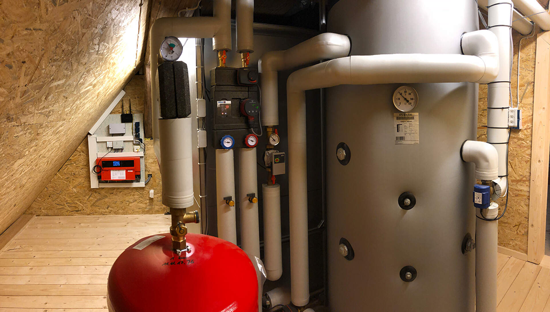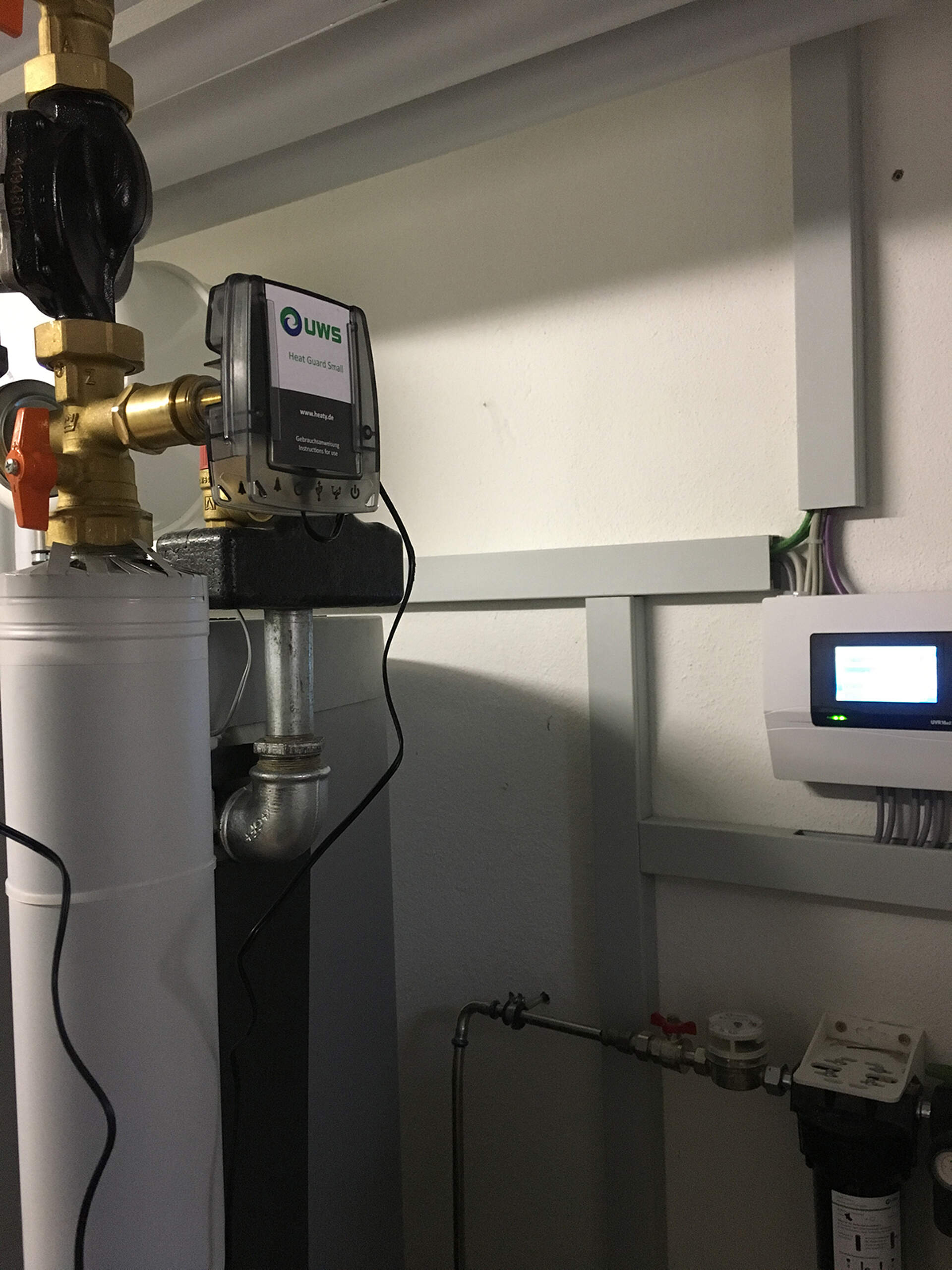Der Kunde wünschte sich eine wartungsarme Heizung und aus regenerativen Energien, worauf man sich für eine Luft-Wasser-Wärmepumpe entschieden hat. Aufgestellt wurde die Wärmepumpe in der nebenstehenden Scheune, die auch als Garage für Rennwagen dient. Allerdings war die vorhandene Fernwärmeleitung zwischen Scheune und Haus für die Mindestwasserumlaufmenge der Wärmepumpe zu klein dimensioniert. Ein zweiter Puffer musste für die WP installiert werden und zu guter Letzt wäre mit der Regelung des Herstellers nur eine Fixwert-Aufheizung des Pufferspeichers möglich gewesen.