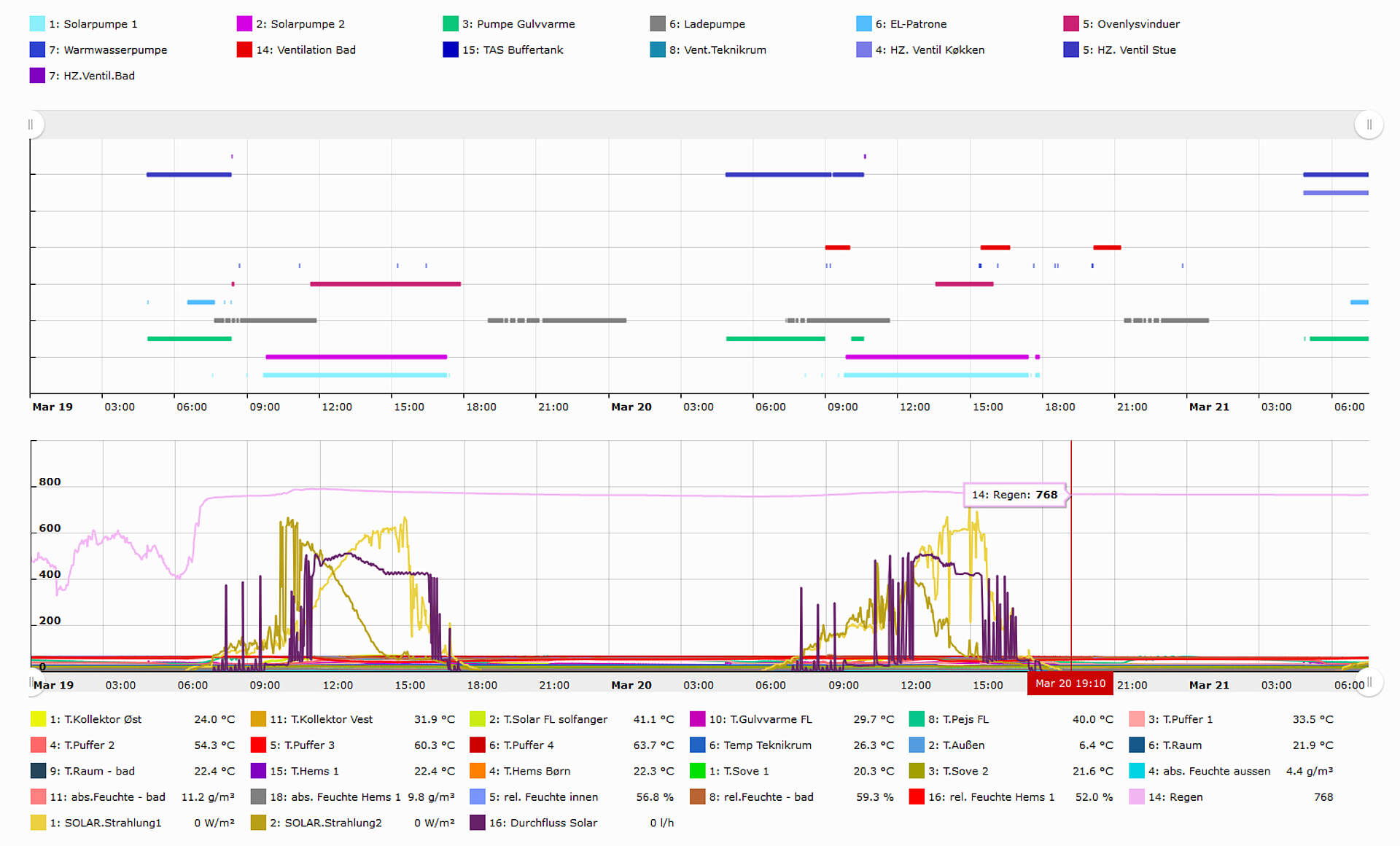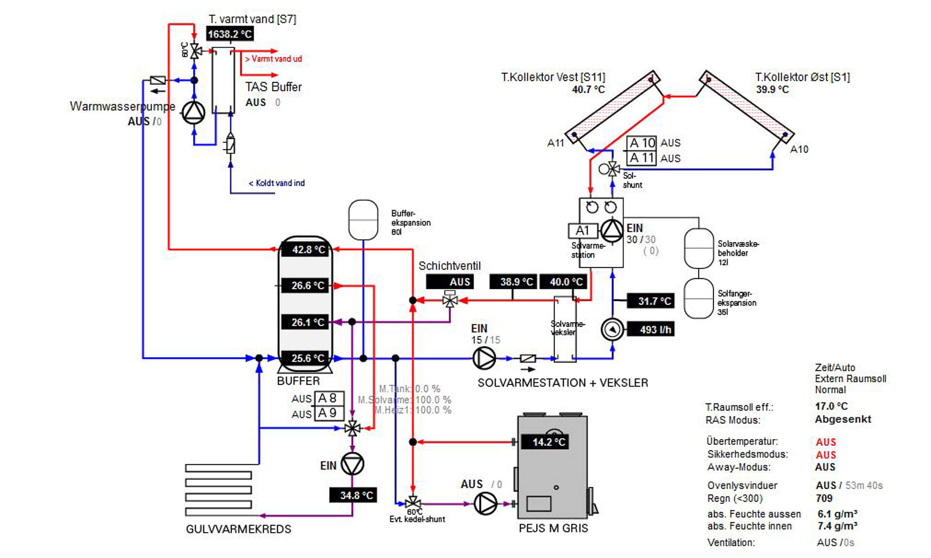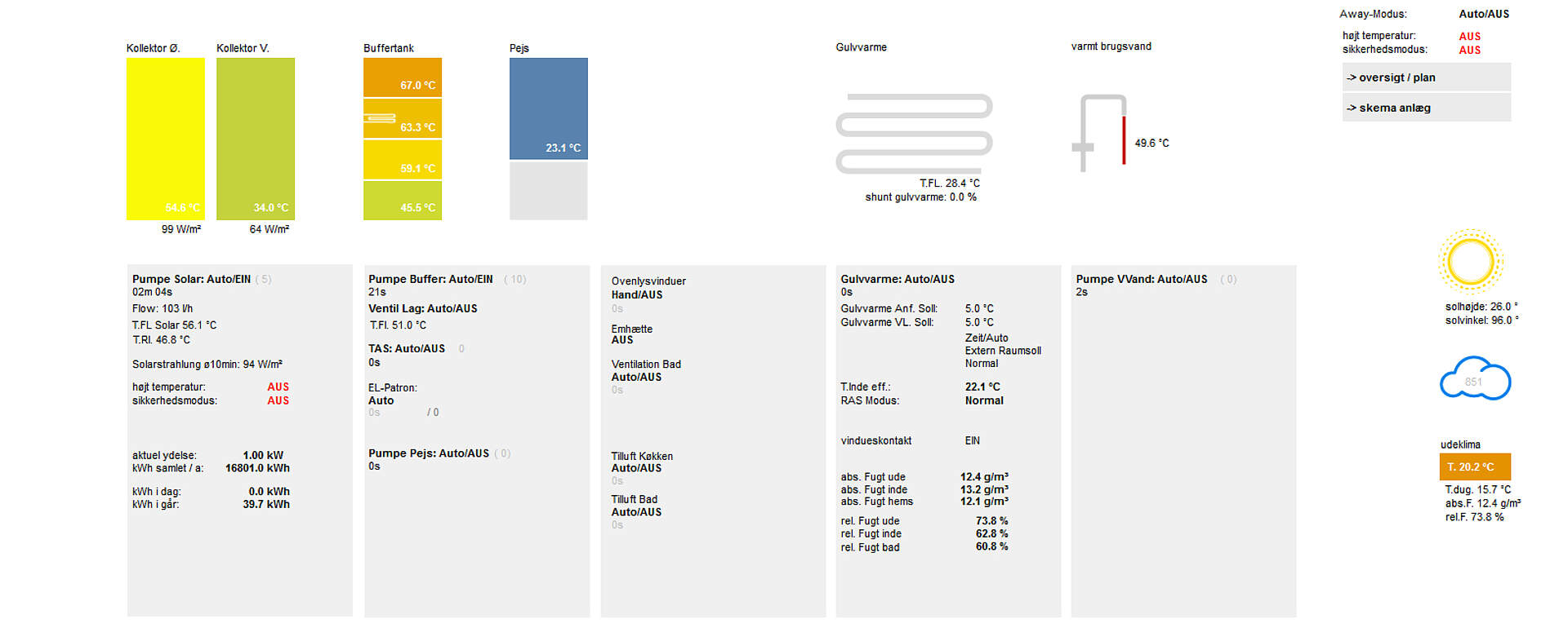 Die gesamte Haussteuerung ist über die UVR16x2 und ein RSM610 sowie einem CMI aufgebaut. Das CMI dient zur Fernsteuerung des Hauses, die Programme in UVR und RSM sind so aufgebaut, dass verschiedene Modi gewählt werden können - je nach Jahreszeit und Anwendung (zuhause / weg).