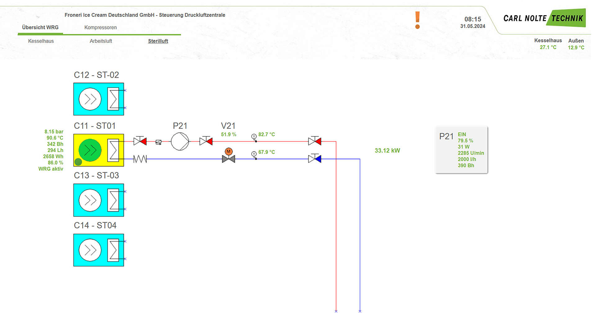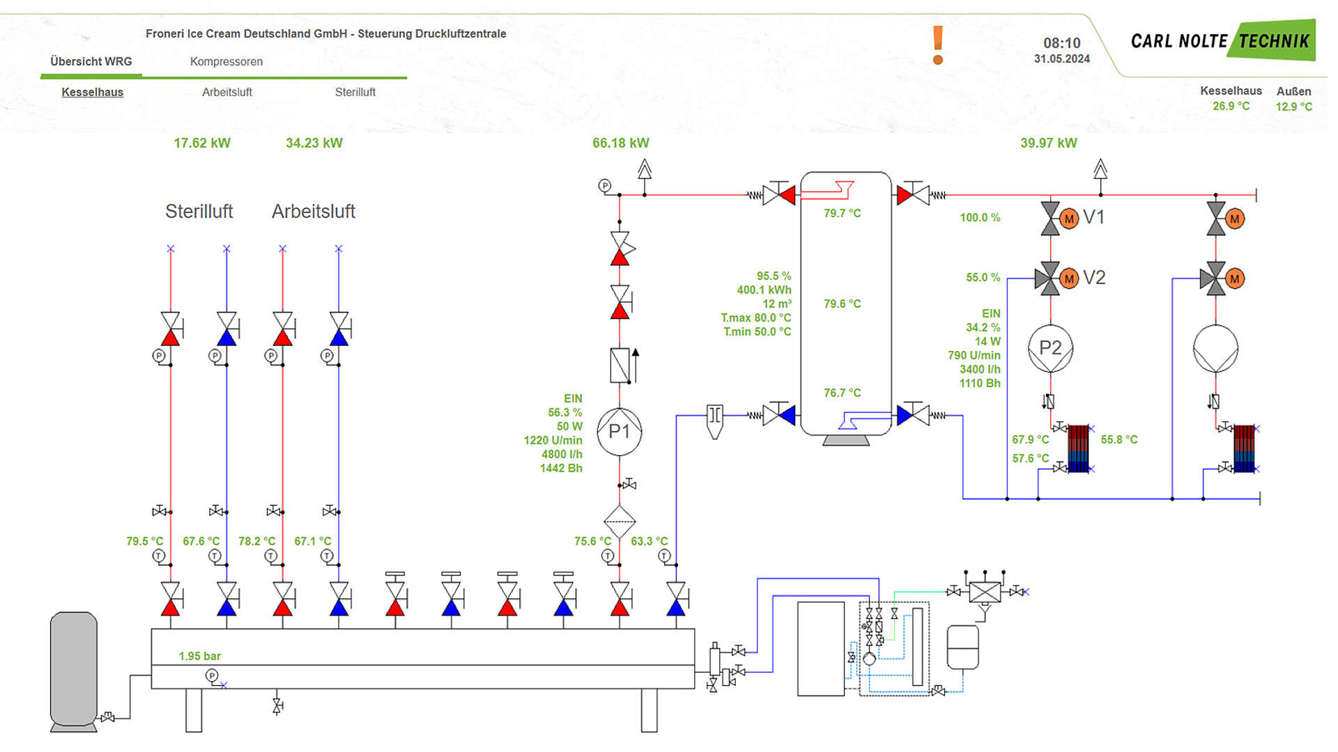 Die Vorlauftemperatur liegt dabei zwischen 85 und 90 °C (bei einer Luftliefermenge von 11 m³/min und einem Enddruck von 8 bar). Diese Energie wird in einen 12.000 Liter Pufferspeicher geladen und zur Warmwasserbereitung weiterverwendet.