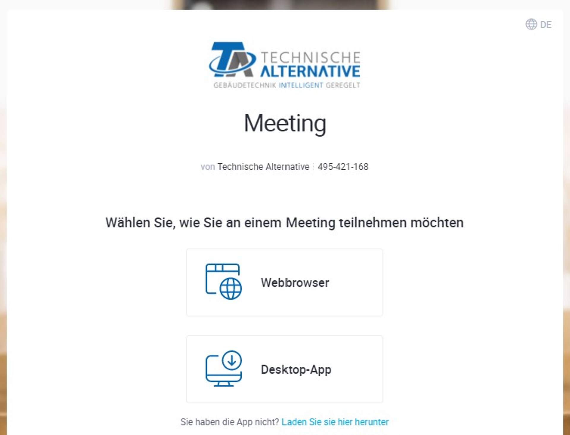 Vor dem Login erhalten Sie die Auswahl, ob Sie die Meetingsoftware im Browser (Google Chrome, Microsoft Edge, Safari, Brave, Firefox, ...) oder per Desktop App starten wollen. Wir empfehlen hier die Auswahl "Webbrowser", raten jedoch davon ab den Firefox Browser zu verwenden. Leider funktioniert er unserer Erfahrung nach nicht immer zuverlässig.