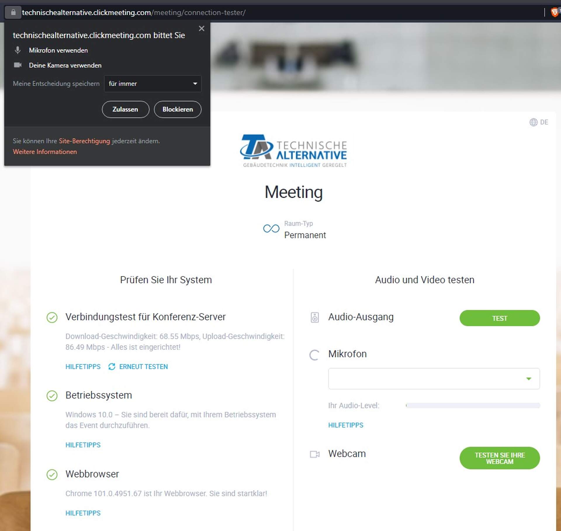 Nach dem Klick auf den grünen Mikrofon- oder Webcam Test-Button fragt Sie Ihr Browser standardmäßig nach Ihrer Erlaubnis, Mikrofon und Kamera verwenden zu dürfen. In den meisten Fällen können Sie Ihre Entscheidung für die aktuelle Website "für immer" speichern oder auch nach dem Ende des Meetings automatisch verwerfen lassen.