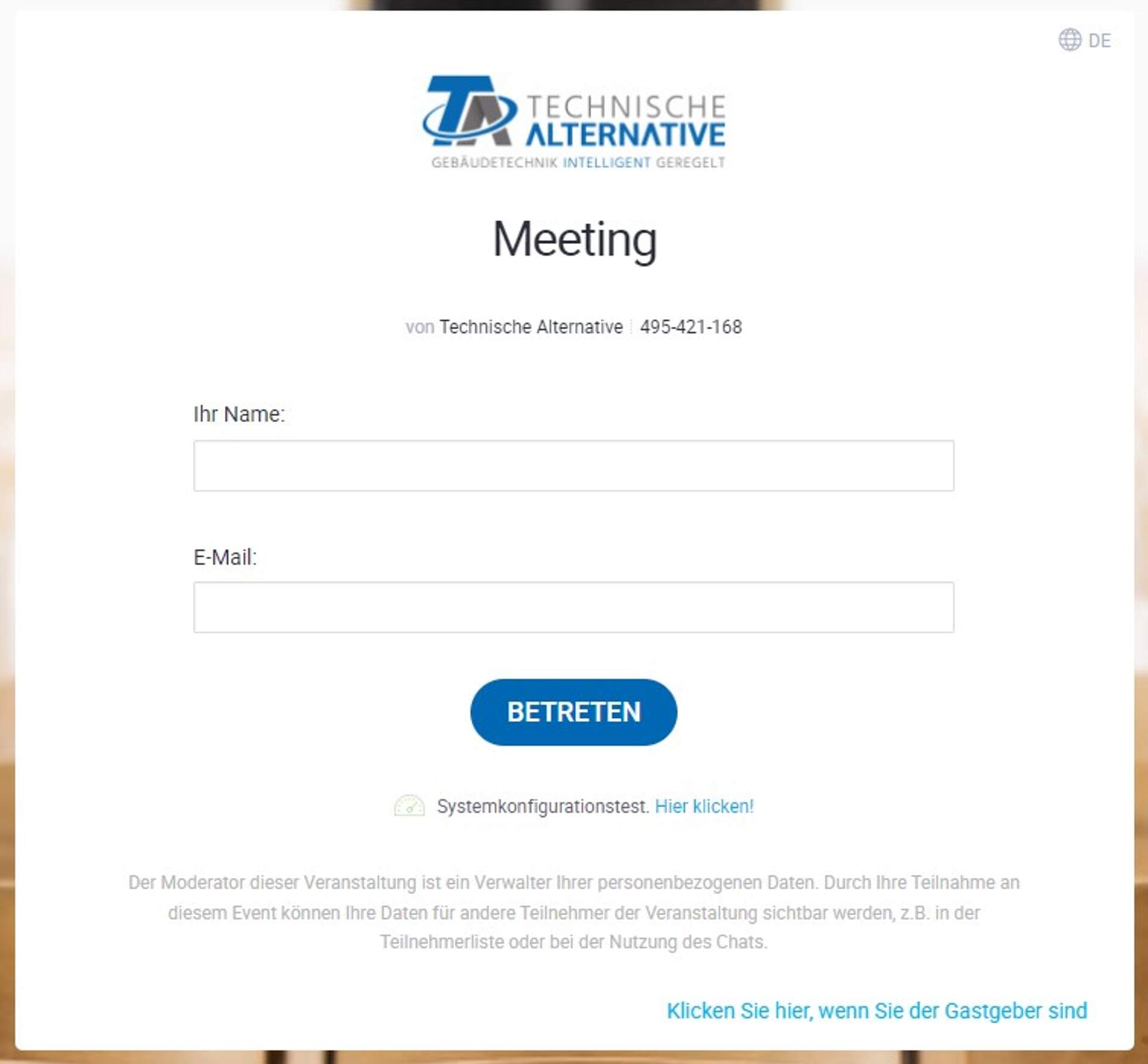 Nach der Auswahl können Sie sich anmelden. Je nach Art der Besprechung kann es sein, dass Sie von uns zusätzlich ein Passwort oder Token für die Anmeldung erhalten (ein Passwort funktioniert für beliebige Teilnehmer, ein Token gilt immer nur für eine/n TeilnehmerIn).