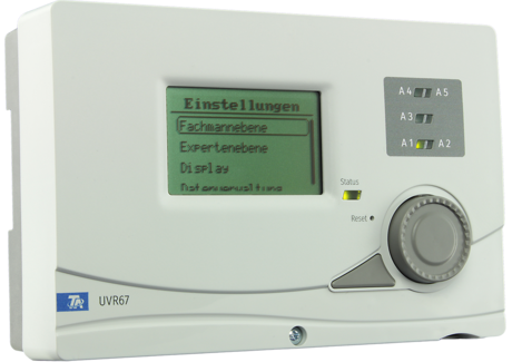 Die UVR67 ist eine Universalregelung mit mehr als 800 Programmen. Sie besitzt verschiedene Thermostat-, Differenztemperatur-, Drehzahlregel- und Heizkreisregelfunktionen für den Einsatz in Solaranlagen und Heizsystemen sowie zur Gebäudetrocknung.