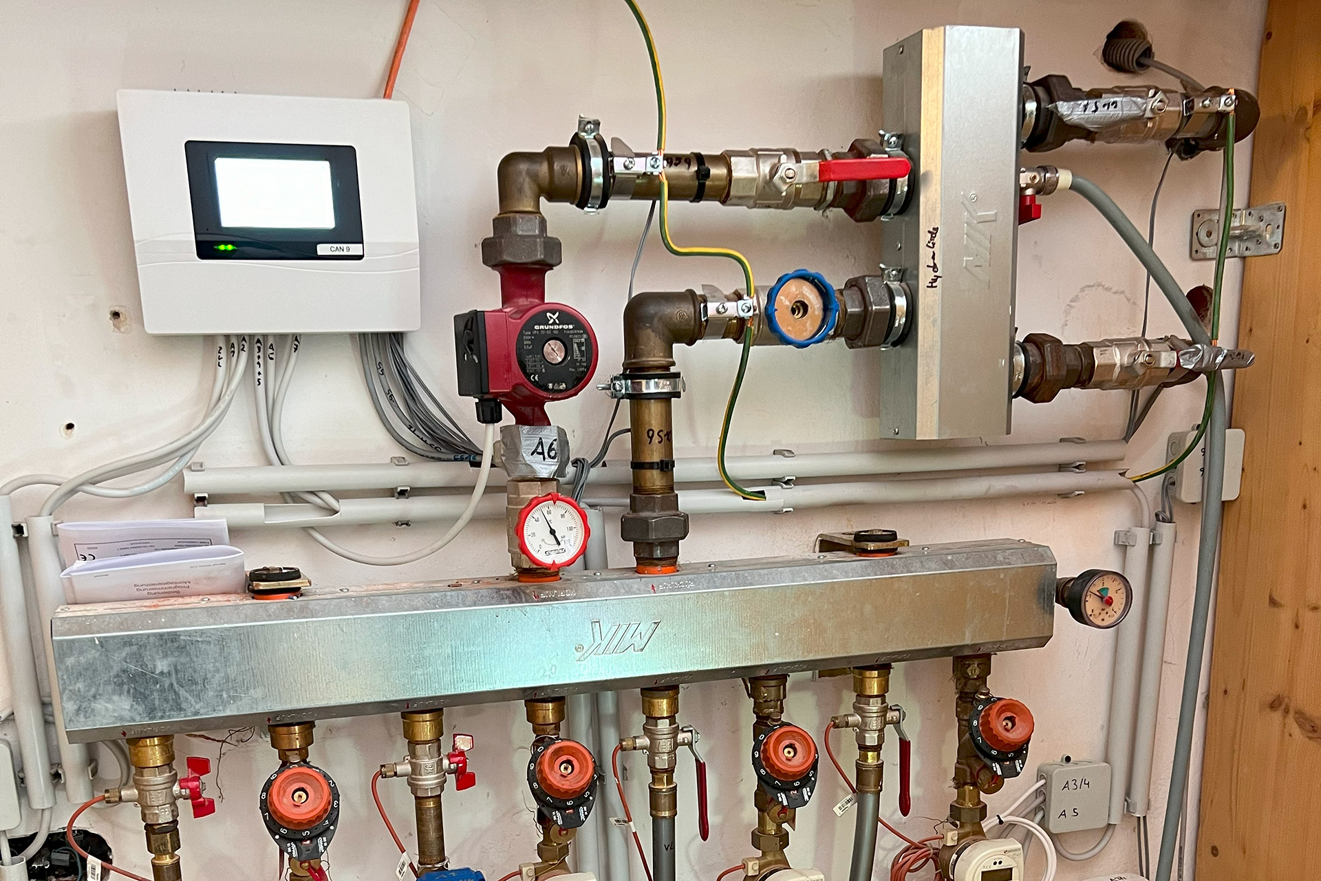 Wie so oft, war auch hier nach mehreren Sanierungsschritten an unterschiedlichen Stellen der eigentliche Heizwärmebedarf nicht mehr nachvollziehbar. Bisher waren eigenständige Regelungen je Gebäudeteil und Verteiler im Einsatz, die untereinander nicht kommunizieren konnten. Eine „Sommer/Winter-Umschaltung“ zum Beispiel, wurde lediglich durch das Aus- und Einstecken der Pumpe realisiert – je nach Außentemperaturen. Der Energieverlust war entsprechend hoch. Wenn man den Kellerabgang betrat, war die Abwärme der Puffer und Rohrleitungen bereits deutlich spürbar.