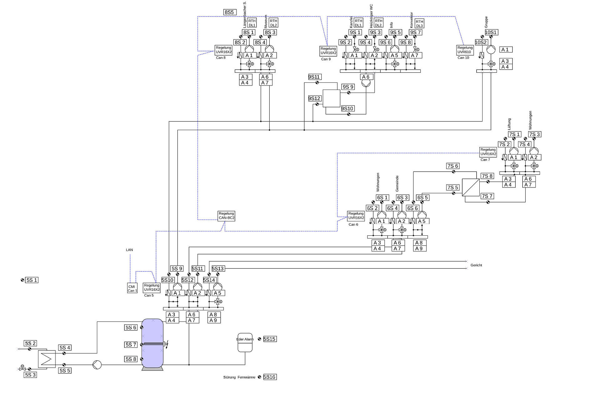 Schnell war klar, dass nur eine übergeordnete Regelung eine Optimierung ermöglichen wird. Die Wahl fiel dann auch auf die frei programmierbaren Universalregler der „TA“. Als zentraler Regler ist eine UVR16x2 bei der Fernwärmeübergabestation im Einsatz. Je Gebäude beziehungsweise Heizungsverteiler werden weitere Regler, je nach Anforderung eine UVR16x2 oder UVR610, verwendet.