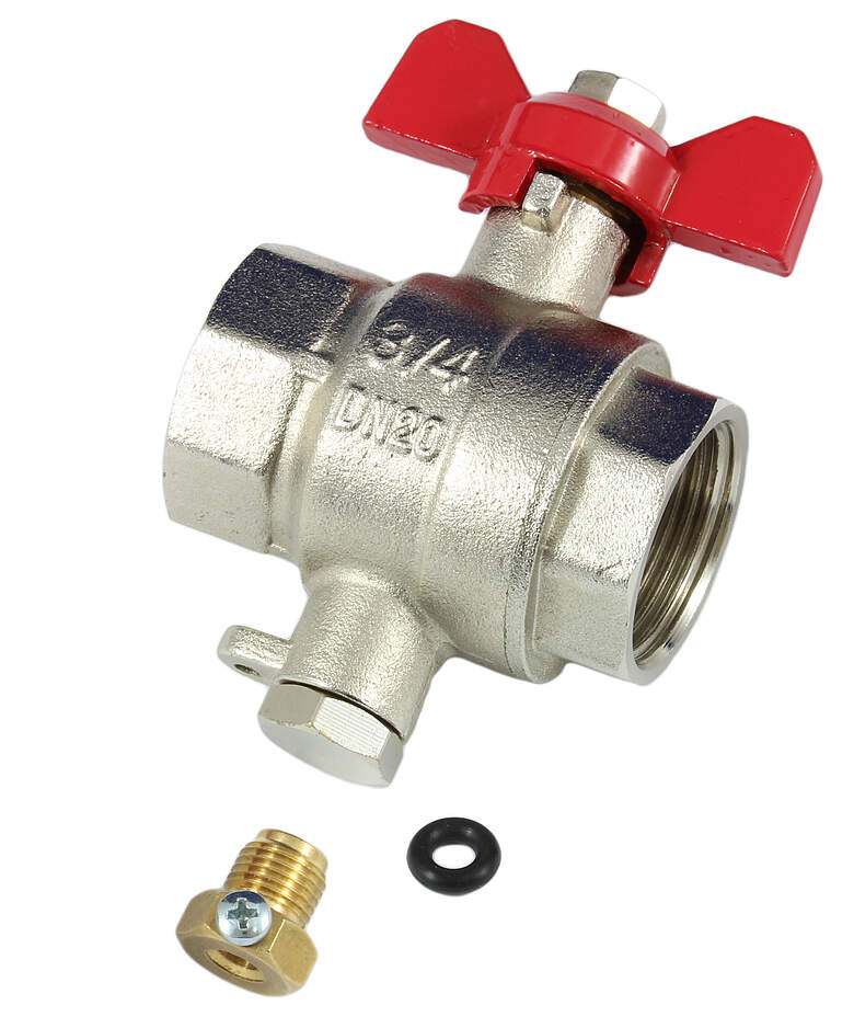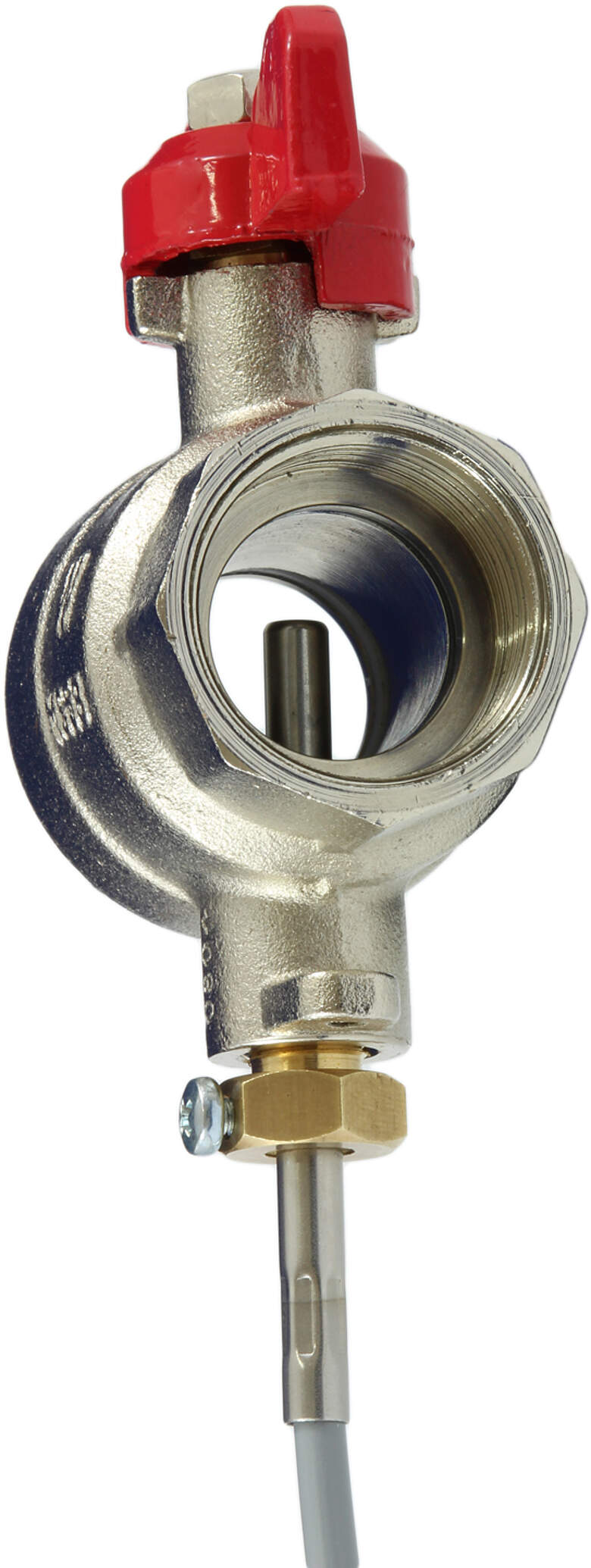 Der Kugelhahn besitzt eine Montageverschraubung M10 x 1 zum Einführen des Temperatursensors 01/BFPT1000 5x60MM zur Wärmemengenzählung. Die Kugel hat an dieser Stelle eine Bohrung. Somit befindet sich der Sensor im Strömungskanal in der Kugel. Beim Absperren wird auch der Sensor abgedichtet und lässt sich einfach ausbauen (z.B. zur Kalibrierung).